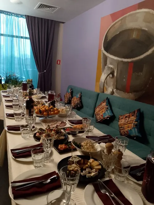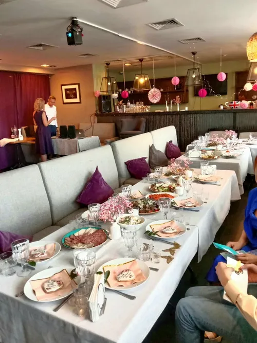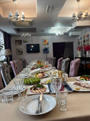 Очень светлый с большими окнами, рассчитан от 35 до 70 человек, подойдет для свадьбы, юбилея, дня рождения, корпоратива, имеет телевизоры.